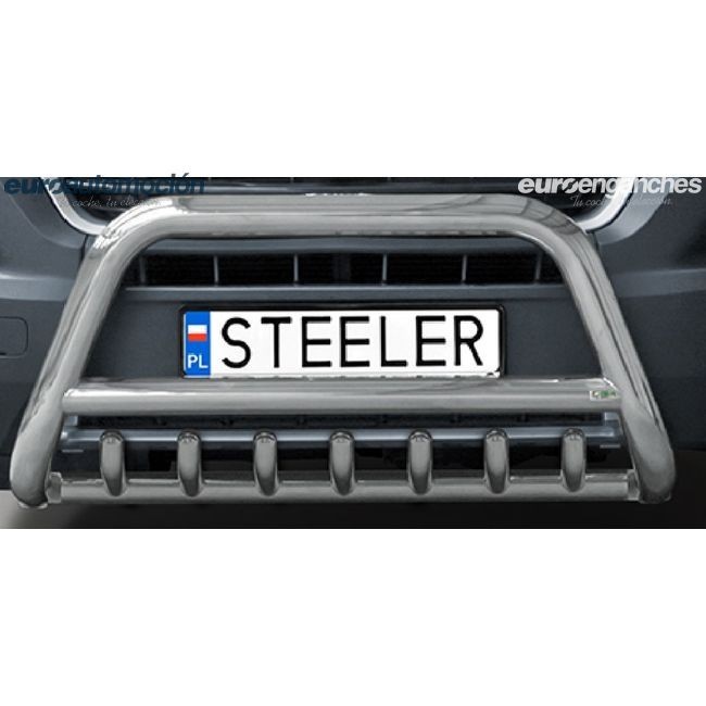 Defensa delantera negra homologada CE y con informe de conformidad gratuito: Elegante barra de protección delantera de acero inoxidable de 70mm de diámetro y con TRAVIESA de 60mm de diámetro. Diseño que incluye PROTECCIÓN DE BAJOS en forma de TUBOS. El tipo de acero inoxidable utilizado es el AISI 304 que tiene una muy alta resistencia a la corrosión. Su espesor es de 2mm y ha sido lacada con pintura plástica en negro muy resistente a las condiciones metereológicas. La garantia suministradas en los artículos pintados en negro es de 12 meses. La foto mostrada es en acero pulido por no poseer de ella en negro, pero se sumistra en negro. Si tiene alguna consulta sobre el producto, no dude en ponerse en contacto con nosotros. NOTA: Como nuestro objetivo es la plena satisfacción del cliente y al ser éste un producto PREMIUM, siempre suministramos artículos nuevos, en perfecto estado y fabricados bajo pedido, por lo que el tiempo de entrega oscila entre las 3 y 5 semanas.